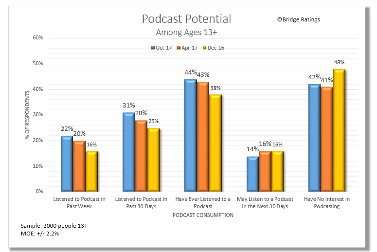 What we have learned is that 2017 has shown even more growth over our original estimates published in January 2017 with a significant increase in the number of people who said that they are listening to one or more podcasts weekly.