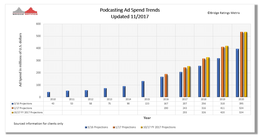 Based on increasing interest by the public, reduced friction to search and access podcasts and interviews with 25 national and regional advertising agencies Bridge Ratings projects 27% ad spend growth in the podcasting universe for 2017 and 29% in 2018 with total 2017 spend nearing $255 million. As the chart below shows, this $255 million figure is an increase over our January estimates for 2017.